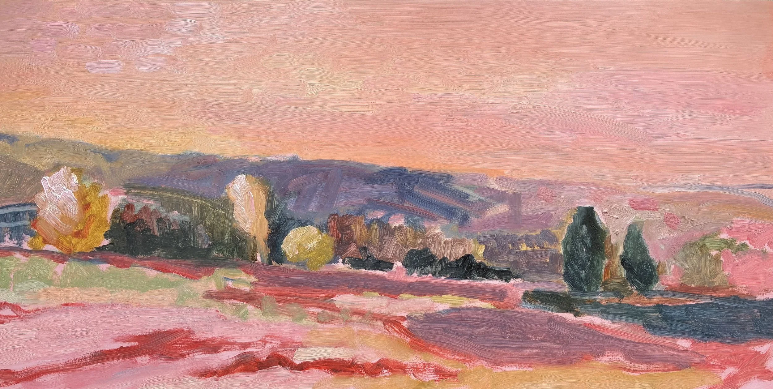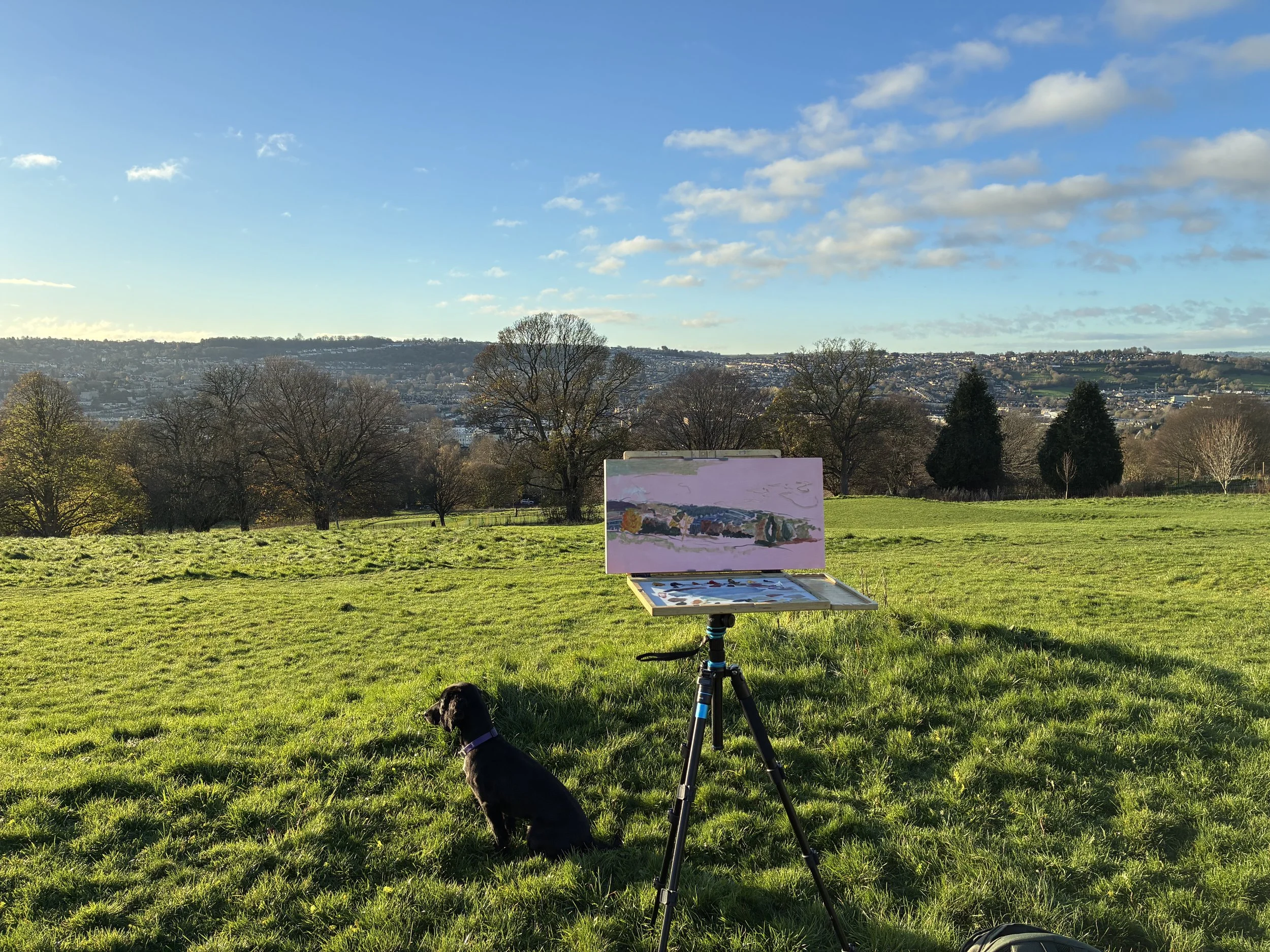 There is no question that I shall always be drawn to that part of Wiltshire and Hampshire that has inspired so many of my paintings. Bath is very different. But we are on the top of a hill with beautiful walks outside our front door and I am out most days with Scout and my sketchbook. I normally carry a Seawhite 25 x 25cm clothbound sketchbook or a Pith sketchbook which has the advantage of lying completely flat when I open it up to sketch. One thing I am discovering is that it is nearly always windy so also have to carry a bulldog clip to stop the pages flying around! The picture above shows my UGO pochade and tripod looking across to the South side of Bath one early morning in January. It is one of a series of new paintings that I shall be adding to my website over the next couple of weeks.