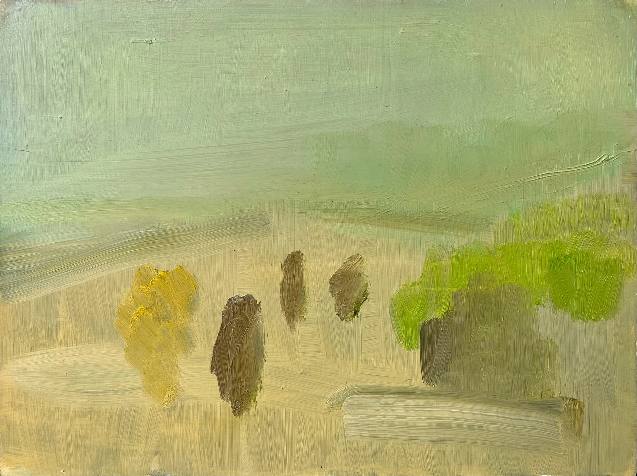 Colour is all important for me but I also like my brushmarks to reflect the feel of a landscape. If I am up early I take my working cocker spaniel Scout up the hill on the Clarendon Way. Looking back towards Broughton I am fascinated by the variety of trees and how they always look different. Spring mornings are fabulous. Pastel yellows and greens set off by a bright turquoise sky. Sometimes less is more and with this landscape it is definitely less!